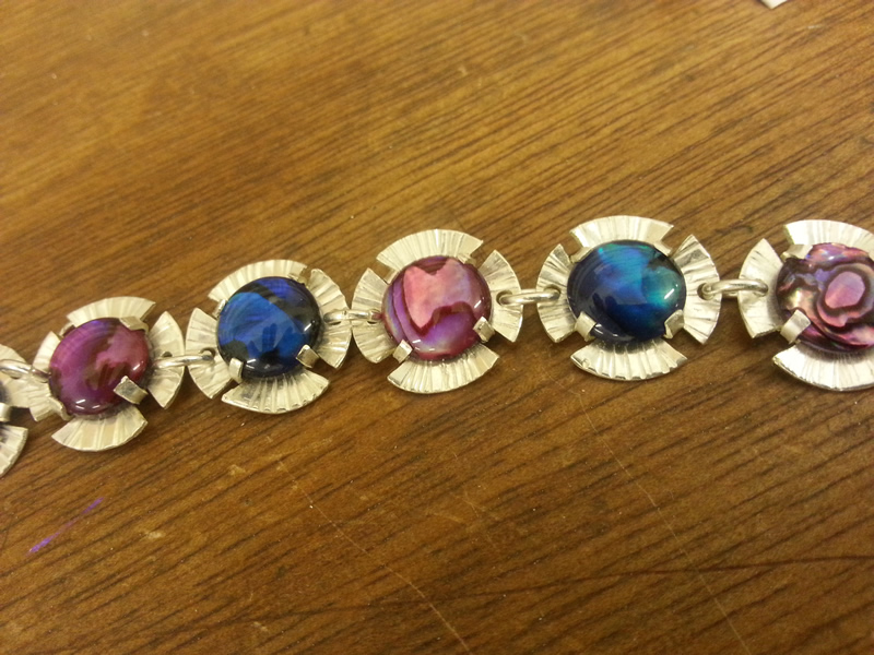 Over the last few weeks I’ve been working on a bracelet made from tiny bits of beautifully coloured shell. I’ve set the shell in little silver ‘flowers’ and am very pleased with the result. Here are some pics of the bracelet being made.